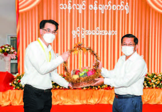 Then, MEC Chairman Lt-Gen Nyo Saw and the official of the factory handed over the gifts marking the opening of the factory to the SAC Chairman Prime Minister who returned a fruit basket to an official of the factory.