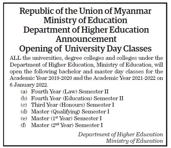 Submitted by moiuser on 1 January 2022 Republic of the Union of Myanmar Ministry of Education Department of Higher Education Announcement Opening of University Day Classes #TheGlobalNewLightOfMyanmar