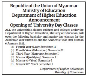 Submitted by moiuser on 2 January 2022 Republic of the Union of Myanmar Ministry of Education Department of Higher Education Announcement Opening of University Day Classes