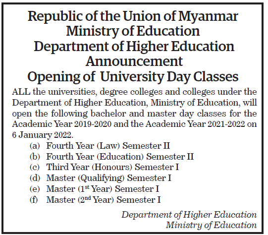 Submitted by moiuser on 3 January 2022 Republic of the Union of Myanmar Ministry of Education Department of Higher Education Announcement Opening of University Day Classes #TheGlobalNewLightOfMyanmar