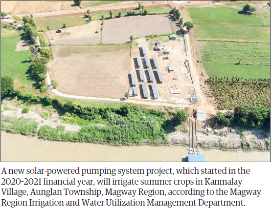 A new solar-powered pumping system project, which started in the 2020-2021 financial year, will irrigate summer crops in Kanmalay Village, Aunglan Township, Magway Region, according to the Magway Region Irrigation and Water Utilization Management Department.