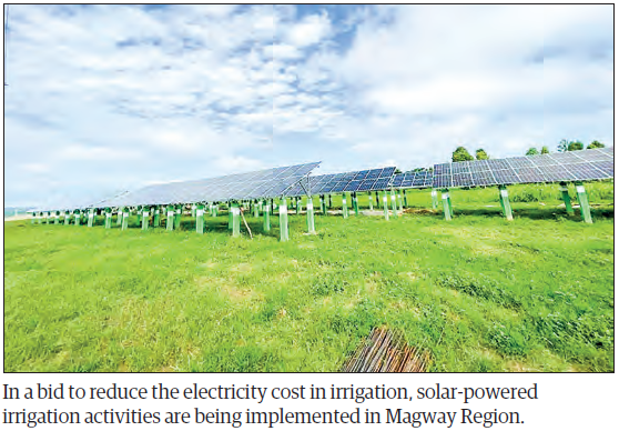 In a bid to reduce the electricity cost in irrigation, solar-powered irrigation activities are being implemented in Magway Region. This renewable resource is aimed for sustainable energy. Solar panels have been installed in Minbu Township, while the Myinkun solar pumping irrigation project is a part of regional budget planning in the 2022-2023FY. More solar pumping irrigation projects will be carried out in the region.
