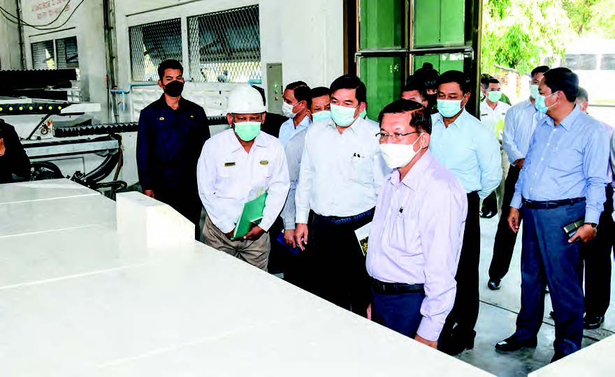 At Marble Tile Factory (Mandalay), Chairman of the Myanmar Economic Corporation Lt-Gen Nyo Saw and officials reported on the production of tiles and plaques to be used on the terrace of Maravijaya Buddha Image precinct in Nay Pyi Taw, and carving of the Buddha images and statues with the use of CNC machines.