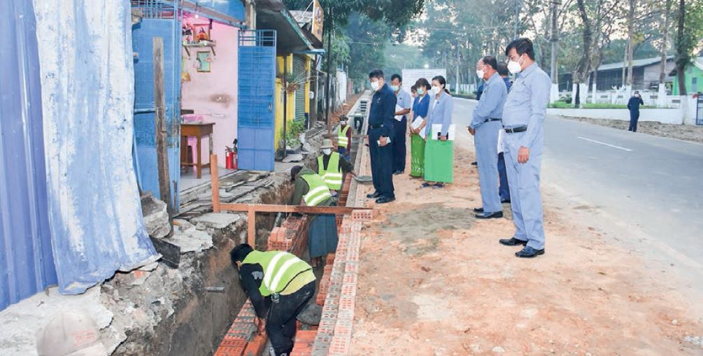 Firstly, the Minister and party inspected the construction site of Thiri Road’s brick drain in North Myoma Ward, Thanlyin Township and instructed officials to collect garbage and waste in Lanmadaw Road which continues to flow from the drains and to improve the access road from houses during construction.