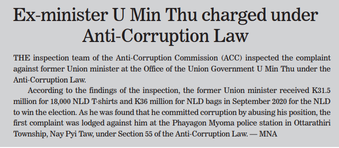Ex-minister U Min Thu charged under Anti-Corruption Law