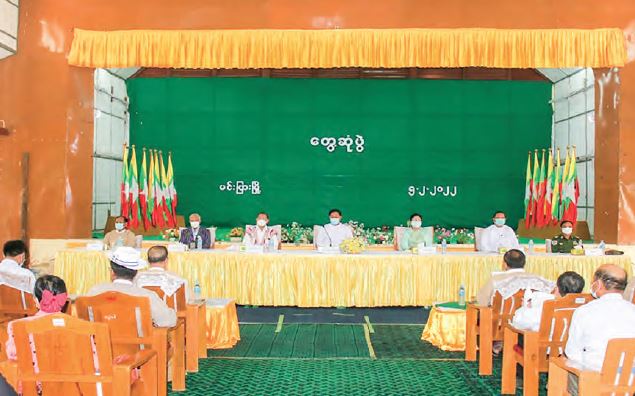 STATE Administration Council Members Admiral Tin Aung San, Mahn Nyein Maung, Daw Aye Nu Sein, U Moung Har, Union Construction Minister U Shwe Lay, Rakhine State Chief Minister Dr Aung Kyaw Min, Commander Maj-Gen Htin Latt Oo of the Western Command and Rakhine state cabinet ministers met departmental personnels, town elders and locals of Minbya Township at the Yar Maung Hall to discuss regional development, social, economic, health and transport sectors yesterday. First, SAC Member Admiral Tin Aung San made a remark regarding measures to ensure smooth trade flows and transport, local stability, social, economic, education and health sectors.