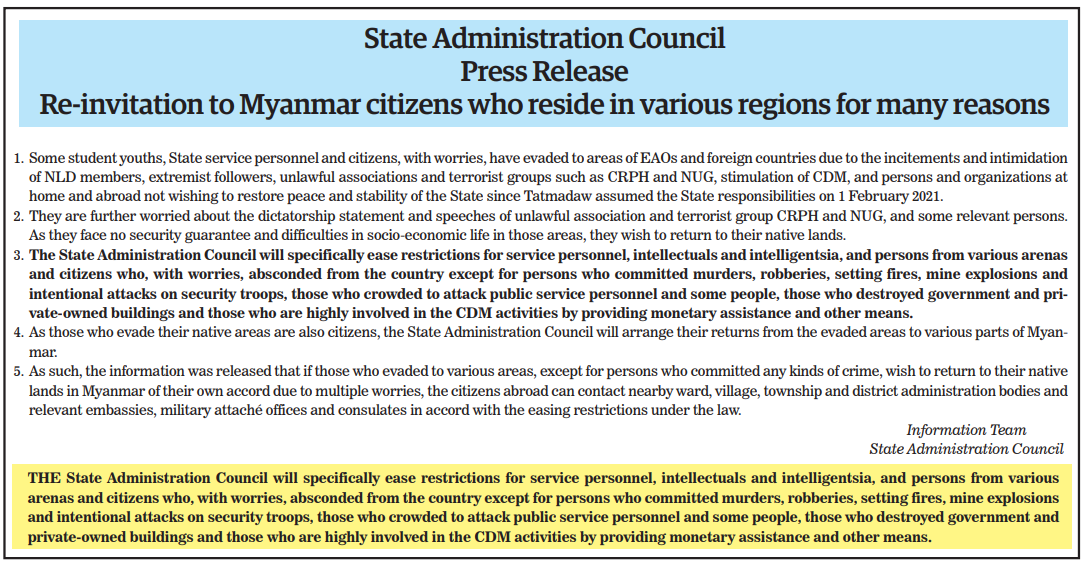 Submitted by moiuser on 7 February 2022 State Administration Council Press Release Re-invitation to Myanmar citizens who reside in various regions for many reasons