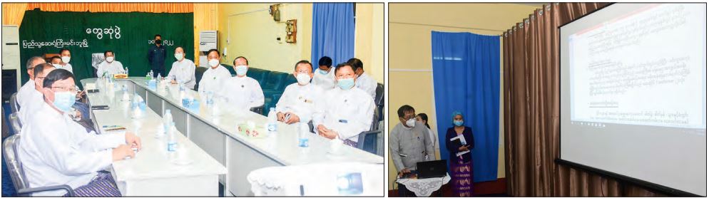 At the meeting hall, Magway Region Public Health Department Head Dr Thaung Hlaing reported on the brief history of the hospital, medical treatments for various patients, progress in vaccination of anti-COVID-19 pandemic, functioning of the teaching hospital, preparation for ICU of the hospital and requirements.