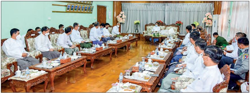Firstly, Ministers of the Magway regional government and district administrators presented the preparation for livestock farming and hatcheries in rivers and plans for goat breeding by forming cooperative societies, condition of cotton cultivation, the completion status of COVID-19 vaccination, the situation of local security and the rule of law.