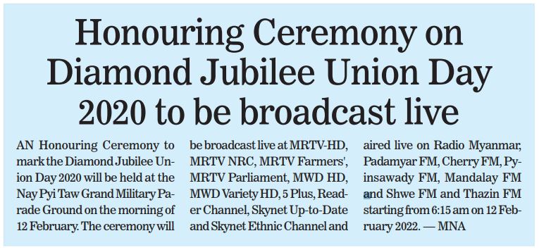 AN Honouring Ceremony to mark the Diamond Jubilee Union Day 2020 will be held at the Nay Pyi Taw Grand Military Parade Ground on the morning of 12 February. The ceremony will be broadcast live at MRTV-HD, MRTV NRC, MRTV Farmers', MRTV Parliament, MWD HD, MWD Variety HD, 5 Plus, Reader Channel, Skynet Up-to-Date and Skynet Ethnic Channel and aired live on Radio Myanmar, Padamyar FM, Cherry FM, Pyinsawady FM, Mandalay FM and Shwe FM and Thazin FM starting from 6:15 am on 12 February 2022.
