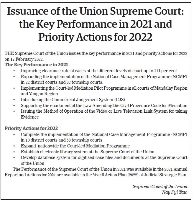 Submitted by moiuser on 18 February 2022 Issuance of the Union Supreme Court: the Key Performance in 2021 and Priority Actions for 2022 #TheGlobalNewLightOfMyanmar