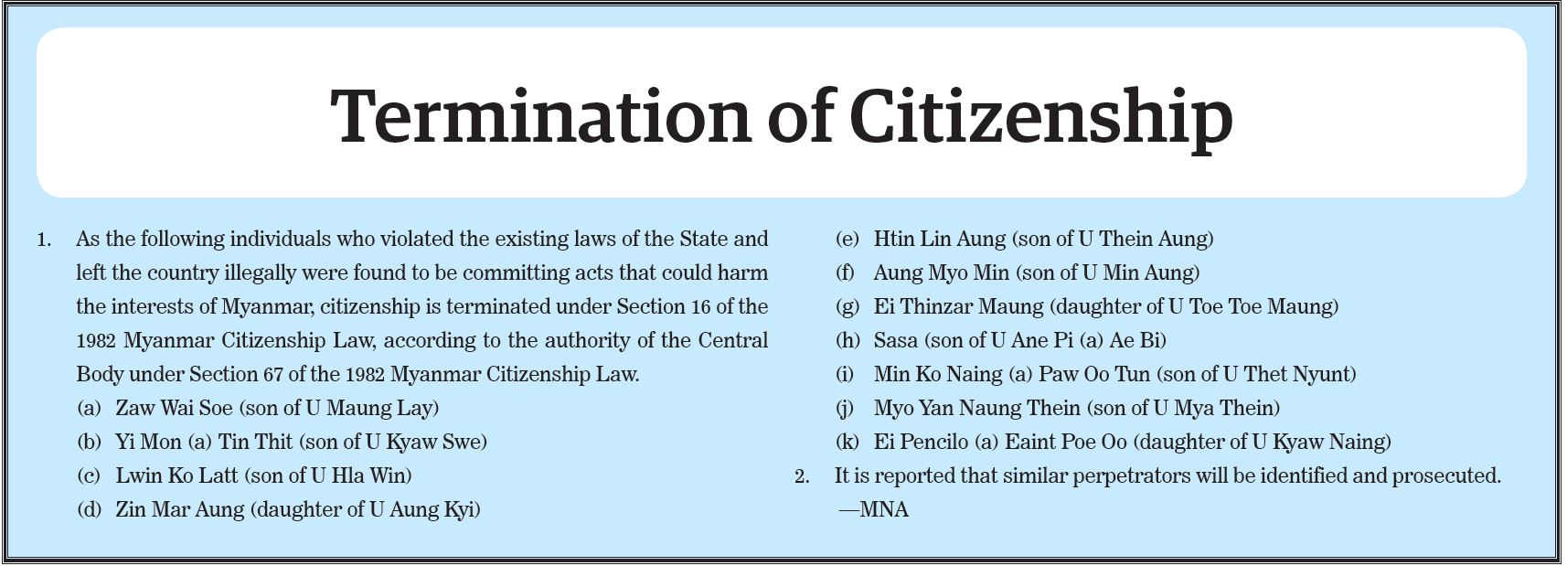 Announcement of the list of Pyithu Hluttaw constituencies, Amyotha Hluttaw FPTP constituencies and Region or State FPTP constituencies where the election will not be held Announcement 171/2025