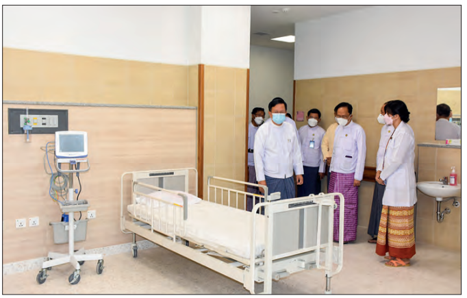 First, the Union minister, the Magway Region chief minister, and Director-General Dr Myat Wunna Soe cut the ribbon to open the new three-storey maternity and newborn babies ward, and the Secretary of the State Administration Council opened a signboard of the new three-storey maternity and newborn babies ward.