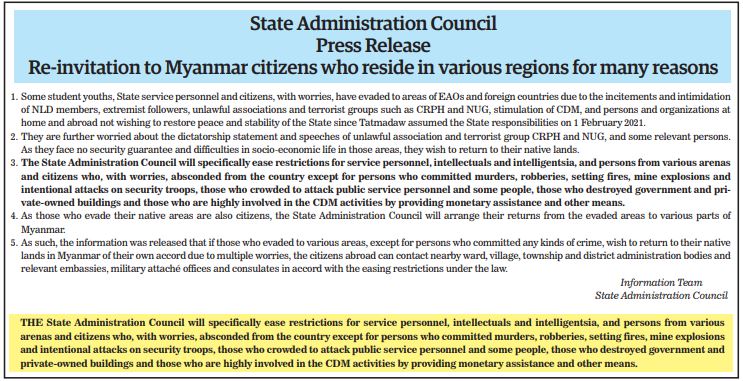 Submitted by moiuser on 18 March 2022 State Administration Council Press Release Re-invitation to Myanmar citizens who reside in various regions for many reasons