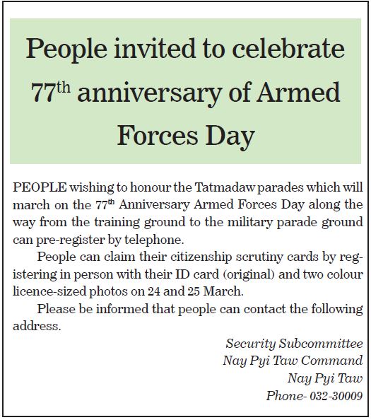 Submitted by moiuser on 20 March 2022 People invited to celebrate 77th anniversary of Armed Forces Day #TheGlobalNewLightOfMyanmar