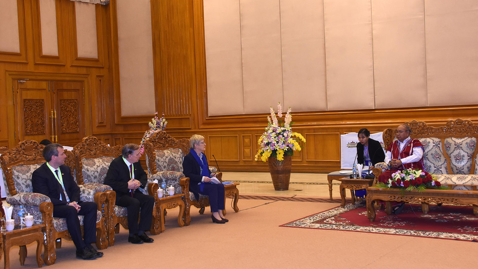 Speaker of Amyotha Hluttaw Mahn Win Khaing Than received Chair Mrs Renate Kunast of the German-ASEAN Parliamentary Friendship Group at the Hluttaw Guest Hall in Nay Pyi Taw yesterday.