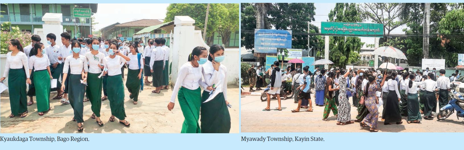 This year, the Ministry of Education opened 20 foreign exam centres and 1,238 local exam centres. A total of 281,741 students out of 312,424 students registered to take the first day of the exam took the Myanmar language exam, accounting for 90.18 per cent, according to the Ministry of Education.