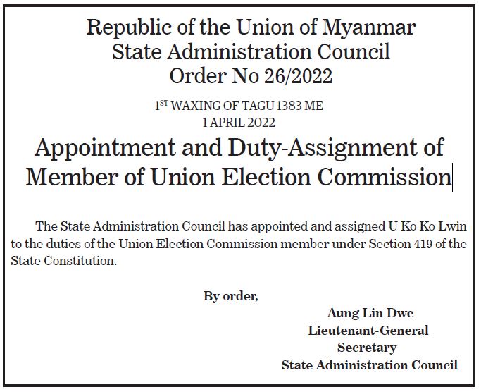 Submitted by moiuser on 2 April 2022 Appointment and Duty-Assignment of Member of Union Election Commission #TheGlobalNewLightOfMyanmar