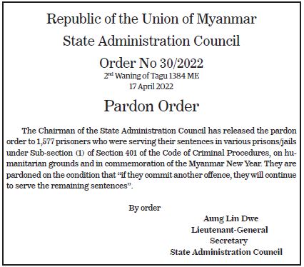 Submitted by moiuser on 18 April 2022 Republic of the Union of Myanmar State Administration Council Order No 30/2022 2nd Waning of Tagu 1384 ME 17 April 2022 Pardon Order