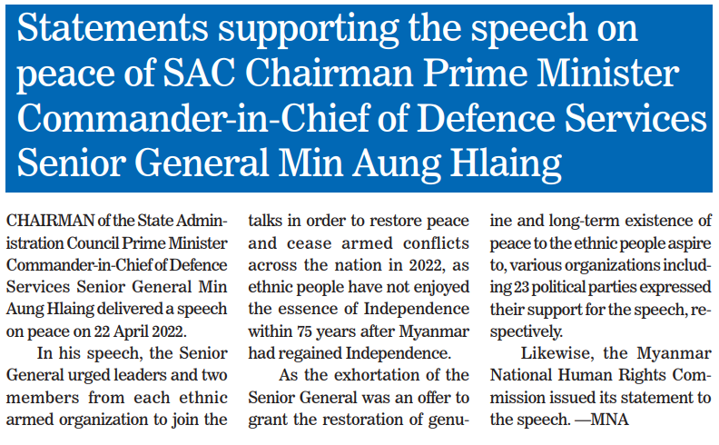 Submitted by moiuser on 29 April 2022 Statements supporting the speech on peace of SAC Chairman Prime Minister Commander-in-Chief of Defence Services Senior General Min Aung Hlaing #TheGlobalNewLightOfMyanmar