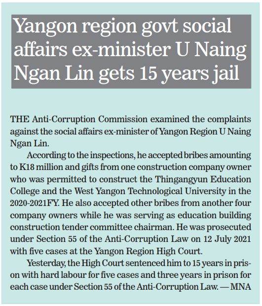 Submitted by moiuser on 29 April 2022 Yangon region govt social affairs ex-minister U Naing Ngan Lin gets 15 years jail #TheGlobalNewLightOfMyanmar
