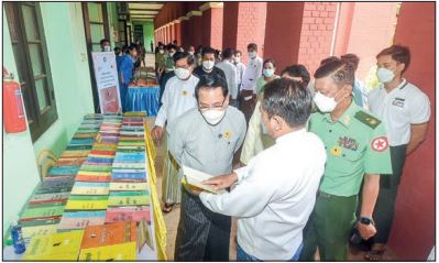 The Union minister and attendees viewed Myanmar encyclopedias displayed at the hall.