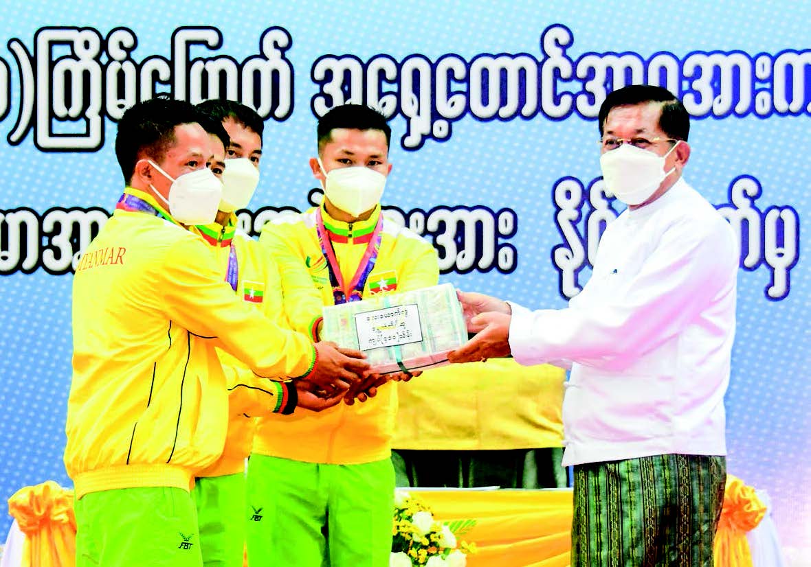 The Vice-Chairman of the SAC Deputy Prime Minister also presented cash awards to silver medallists in the canoeing and kayak, billiards and snooker, shooting and Wushu sports events. The SAC members, Union ministers, the Commander-in-Chief (Navy), the Commander-in-Chief (Air) and senior military officers handed silver and bronze medallists, coaches and administrative officials in the respective sports. On behalf of the victorious athletes, Vovinam athlete Ma May Honey Aung Lwin spoke words of thanks. Then, the Senior General and party gave a tea party to victorious athletes and coaches in their honour. As part of encouraging the athletes, the government presented K200,000 and US$200 each to athletes, K100,000 and US$100 each to coaches at the handing over ceremony of the flag to ensure the victory. During the SEA Games, gold medallists were awarded US$3,000, silver medallists US$2,000, bronze medalists US$1,000 in the singles events and US$1,000 for gold medallists, US$750 for silver medallists and US$500 for bronze medallists in the team-wise events and the Myanmar national women’s football team US$ 100,000 for its capability to compete in the semifinal match.