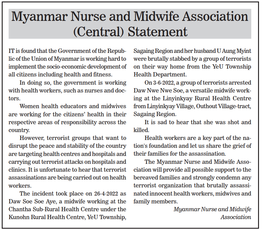 Submitted by moiuser on 9 June 2022 Myanmar Nurse and Midwife Association (Central) Statement #TheGlobalNewLightOfMyanmar