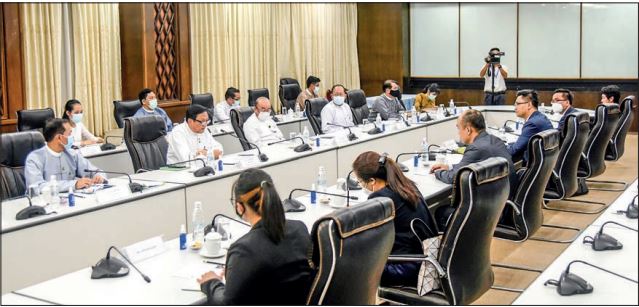 MEMBERS of the Task Force for the facilitation of ASEAN Humanitarian Assistance to Myanmar through the AHA Centre; U Kyaw Myo Htut, Deputy Minister of the Ministry of Foreign Affairs, Dr Aye Htun, Deputy Minister of the Ministry of Health and U Aung Tun Khaing, Deputy Minister of the Ministry of Social Welfare, Relief and Resettlement met a Cambodian delegation led by Dr Kung Phoak, Secretary of State of the Ministry of Foreign Affairs and International Cooperation and Head of the office of the Special Envoy of the ASEAN Chair on 9 June 2022 at the Ministry of Foreign Affairs in Nay Pyi Taw.