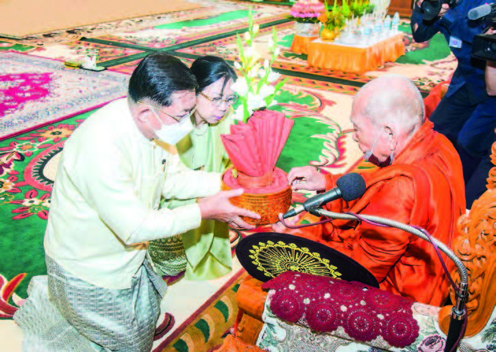 After the ceremony, the Senior General and wife, the Vice-Senior General and wife, and senior military officers offered day meals to members of the Sangha led by Chairman Bhamo Sayadaw.