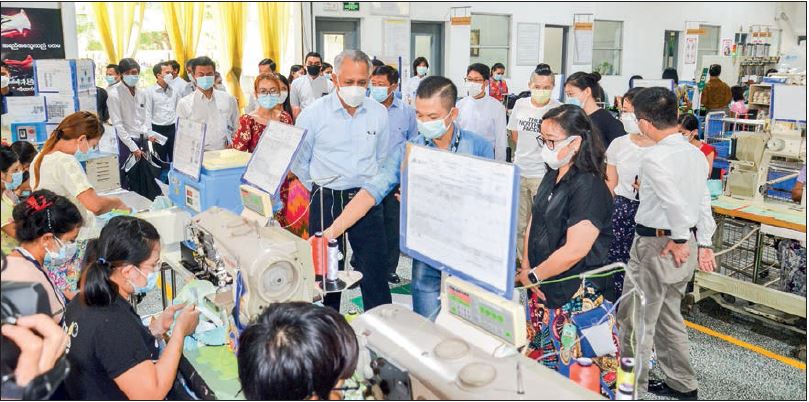 UNION Minister for Investment and Foreign Economic Relations U Aung Naing Oo visited the garment factory of the Panko Bago Co., Ltd, a foreign investment company operating with the permission of the Myanmar Investment Commission in Bago Township, Bago Region, on the afternoon of 8 July.