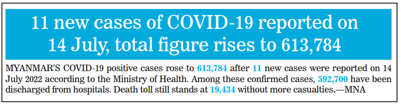 Submitted by moiuser on 15 July 2022 11 new cases of COVID-19 reported on 14 July, total figure rises to 613,784 #TheGlobalNewLightOfMyanmar