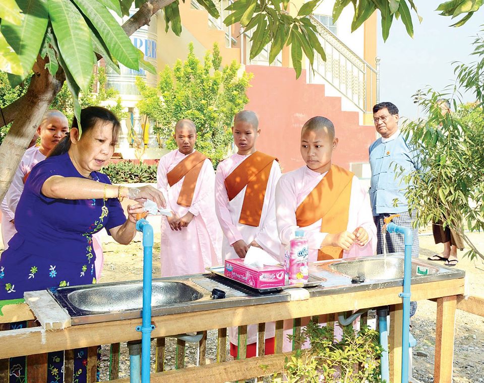 Dr San San Aye, the Director-General of Social Welfare Department, and officials demonstrated washing hands.