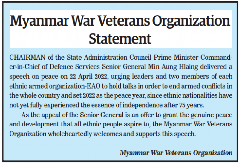 1. YMBA found that Chairman of the State Administration Council of the Republic of the Union of Myanmar Prime Minister Commander-in-Chief of Defence Services Senior General Min Aung Hlaing invited ethnic armed organizations-EAOs leaders to hold a meeting in order to end armed conflicts across the nation in his speech made on 22 April 2022.