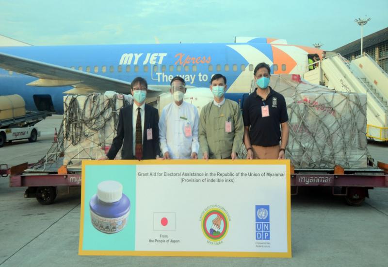 A total of 113,000 bottles of indelible ink supported by the Japanese government and its people arrived in Yangon by a special flight from Kuala Lumpur of Malaysia yesterday afternoon.