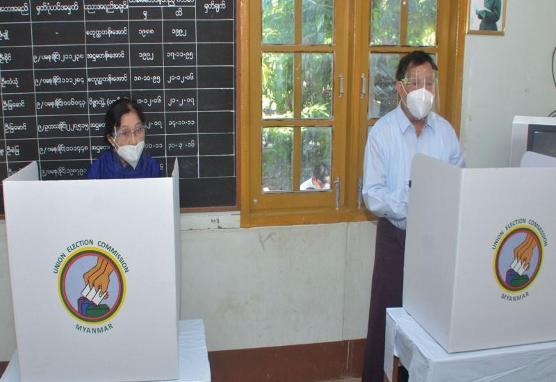 CHIEF Justice of the Union U Tun Tun Oo and wife Daw Aye Aye Thein cast their advance votes together with Chairman of the Constitutional Tribunal of the Union U Myo Nyunt and wife Daw Htay Yi, and Chairman of the Union Election Commission U Hla Thein and wife Daw Aye Thidar in Nay Pyi Taw yesterday morning.