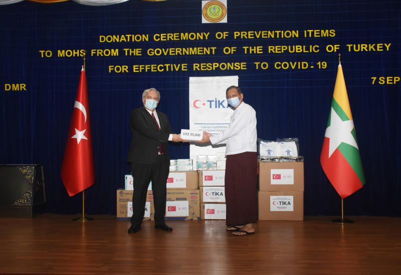 Government of the Republic of Turkey donated COVID-19 prevention items to Ministry of Health and Sports of Myanmar for the effective response to the pandemic yesterday.