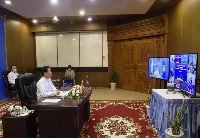 U Soe Han, Permanent Secretary of the Ministry of Foreign Affairs participated in the ASEAN Senior Officials’ Meeting and Meeting of the Executive Committee of the Southeast Asia Nuclear Weapon-Free Zone Commission (SEANWFZ Commission) which were held via video conference yesterday at 8:00 am from the Ministry of Foreign Affairs, Nay Pyi Taw.