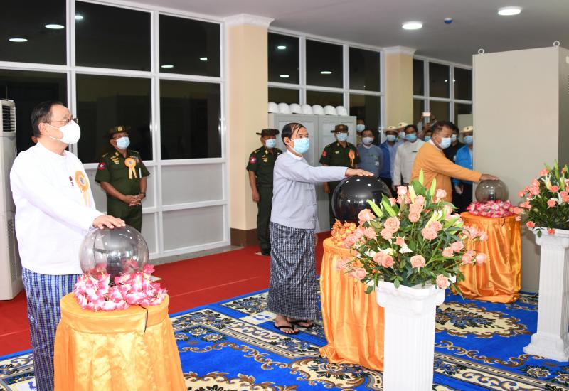 President U Win Myint attended the ceremony to commission into service the 151.8-mile-long 230-kV Namhsan-Mongpyin-Kengtung national grid, the 230/66/11 kV 100 Mva Kengtung main electrical substation, the 230/66/11 kV 60 MVA Mongpyin main electrical substation and the transmission of electricity from the National Grid to the Shan State (East), and delivered the keynote address yesterday morning.