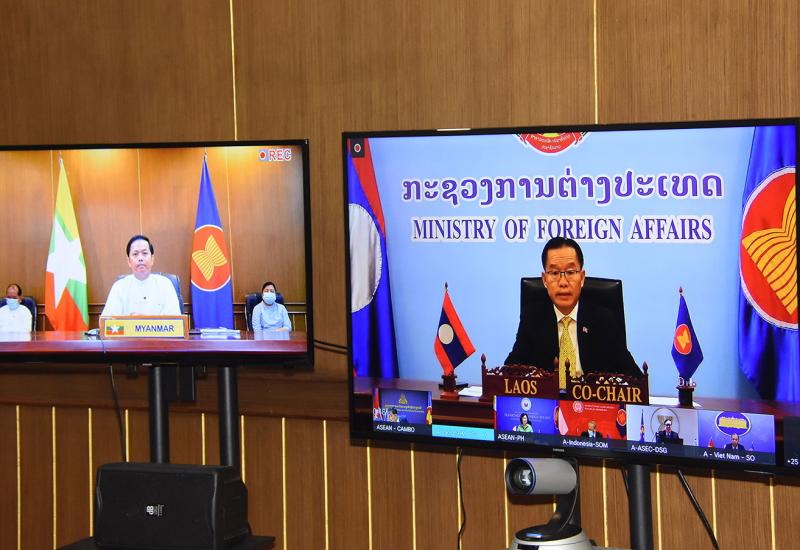 Permanent Secretary of the Ministry of Foreign Affairs U Soe Han participated in the 33rd ASEAN-US Dialogue which was held via videoconference from the Ministry of Foreign Affairs, Nay Pyi Taw yesterday.