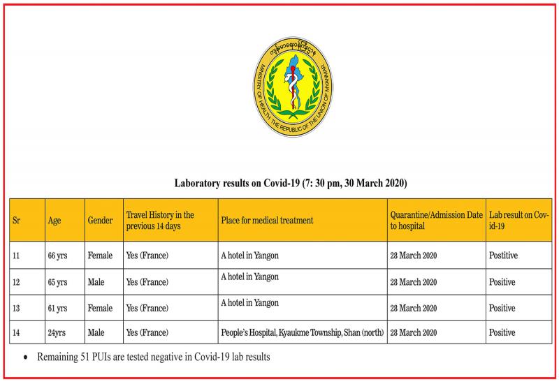 1. Laboratory results of the National Health Laboratory (Yangon) on the specimens from a total of 55 persons under investigation and quarantined persons at 5:15 pm 30 March 2020 have shown two positive cases of Covid-19 (Table 1), and the remaining 51 persons were tested negative.