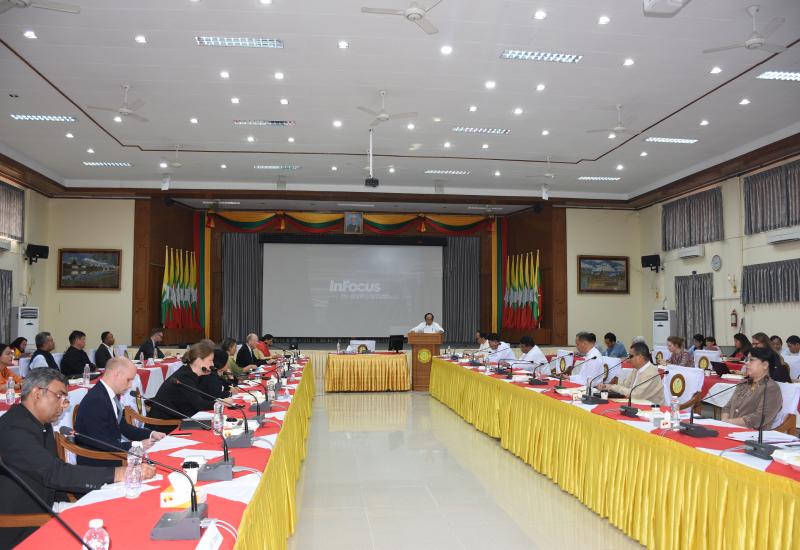 Union Minister Dr Myint Htwe first delivered a speech. He said this meeting aims to develop a better understanding of preparations to contain COVID-19 and to increase collaboration between the foreign embassies, UN agencies, donor organizations, NGOs and affiliated organizations through the representatives attending this meeting.