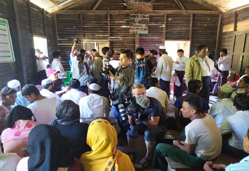 Media crews from Myanmar Now, Eleven Media Group, VOA, CNA, European Pressphoto Agency (EPA), BBC Media Action and Aljazeera met with Maungtaw district officials and common people in Padin Village, Nyaungchaung Village and Shwezar Village where shelters are constructed with the donations of India.