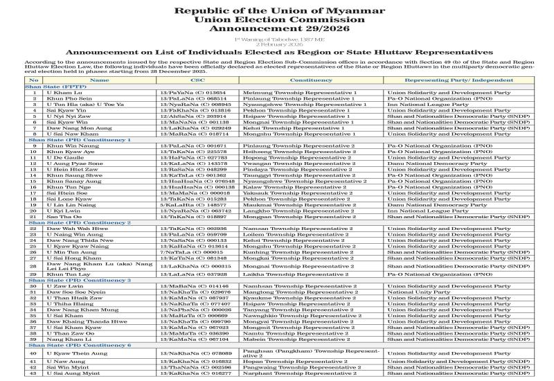 Announcement on List of Individuals Elected as Region or State Hluttaw Representatives
