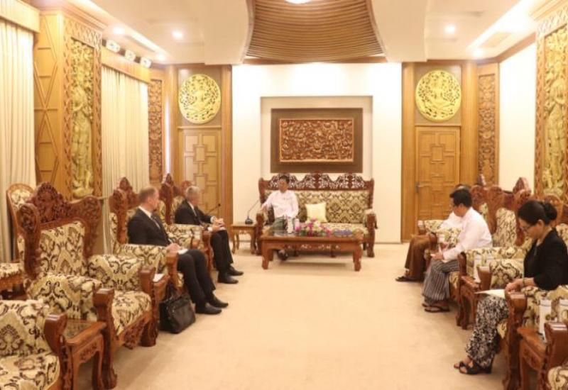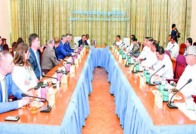 State Administration Council Member, Deputy Prime Minister, and Union Minister for Transport and Communications General Mya Tun Oo received a delegation led by Mr Sholban Kara-Ool, Deputy Chairman of the State Duma of the Federal Assembly of the Russian Federation, at the ministry yesterday.