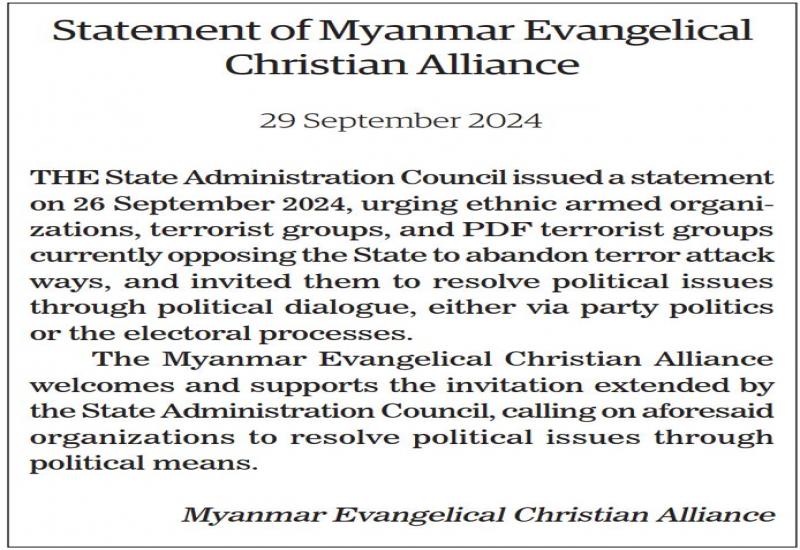 IN light of the losses and damage caused by armed struggle line and acts of terrorism in the country, the State Administration Council issued a statement on 26 September 2024, urging ethnic armed organizations, terrorist groups, and PDF terrorist groups currently opposing the State to abandon terror attack ways. Instead, they are invited to resolve political issues through political dialogue, either via party politics or the electoral processes, to work alongside the people for restoring durable peace and development.