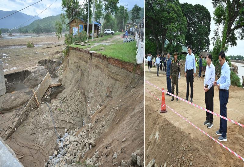 Chairman of the State Administration Council Prime Minister Senior General Min Aung Hlaing, accompanied by Council Joint Secretary General Ye Win Oo, Union ministers U Min Naung and U Myo Thant, Nay Pyi Taw Council Chairman U Than Tun Oo and officials, yesterday morning inspected on-going repairs of roads and bridges damaged in heavy rains and flooding occurrences in Nay Pyi Taw Council Area.