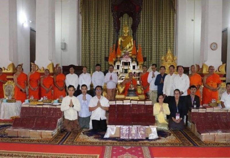 A Myanmar delegation led by Union Minister for Health Dr Thet Khaing Win accompanied by Myanmar Ambassador to Laos U Aung Ko, Myanmar Military Attaché (Army, Navy and Air) Brig-Gen Khin Maung Soe attended the ceremony of offering Tri Pitakat treatises approved by Sixth Buddhist Synod donated by State Administration Council Chairman Prime Minister Senior General Min Aung Hlaing at Thatluang Sangha Nayaka Tipitaka Monastery in Vientiane of Laos, yesterday morning.