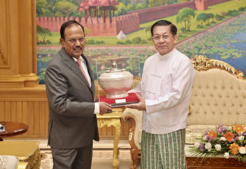 Chairman of the State Administration Council Prime Minister Senior General Min Aung Hlaing received Shri Ajit Doval, National Security Adviser (NSA) of India, at the Office of the State Administration Council Chairman in Nay Pyi Taw yesterday afternoon.