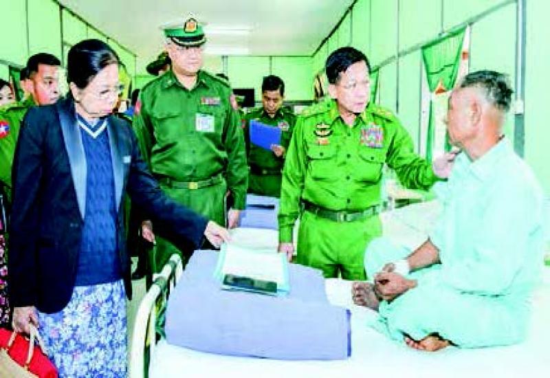 Chairman of the State Administration Council Commander-in-Chief of Defence Services Senior General Min Aung Hlaing, along with his wife Daw Kyu Kyu Hla, visited Tatmadaw members and police members wounded in the line of duty at the local Military Hospital in Lashio, Shan State (North), yesterday.